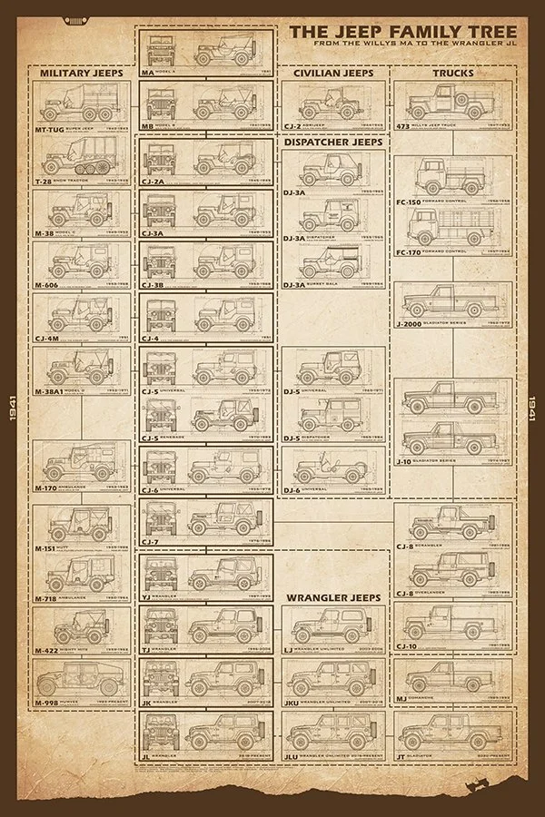 The graphic below shows all the jeeps throughout history, and how they relate to one another. The main column shows the base models, while the off-shoots to the right and left are related models. There are six main groups, shown with dashed lines. These include military jeeps, civilian jeeps, dispatcher jeeps, wrangler jeeps, trucks and wagoneers.